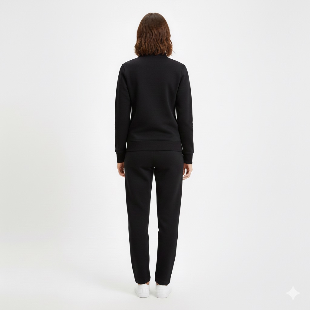 The model is wearing the suit with white sneakers, completing a clean, athletic, and contemporary outfit. The fabric appears to be a comfortable fleece or cotton blend, suitable for layering.